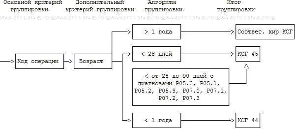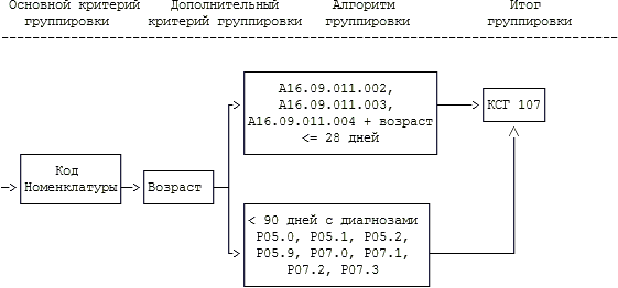 - при возрасте ребенка до 28 дней (код 1) случаи классифицируются в КСГ 45 или 107 по соответствующему коду номенклатуры, независимо от кода диагноза;