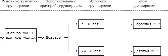 По каждому случаю в реестре пролеченных больных классификационные критерии КСГ и их комбинации анализируются с помощью таблицы "Группировщик" по следующему алгоритму: