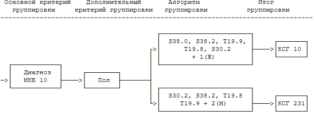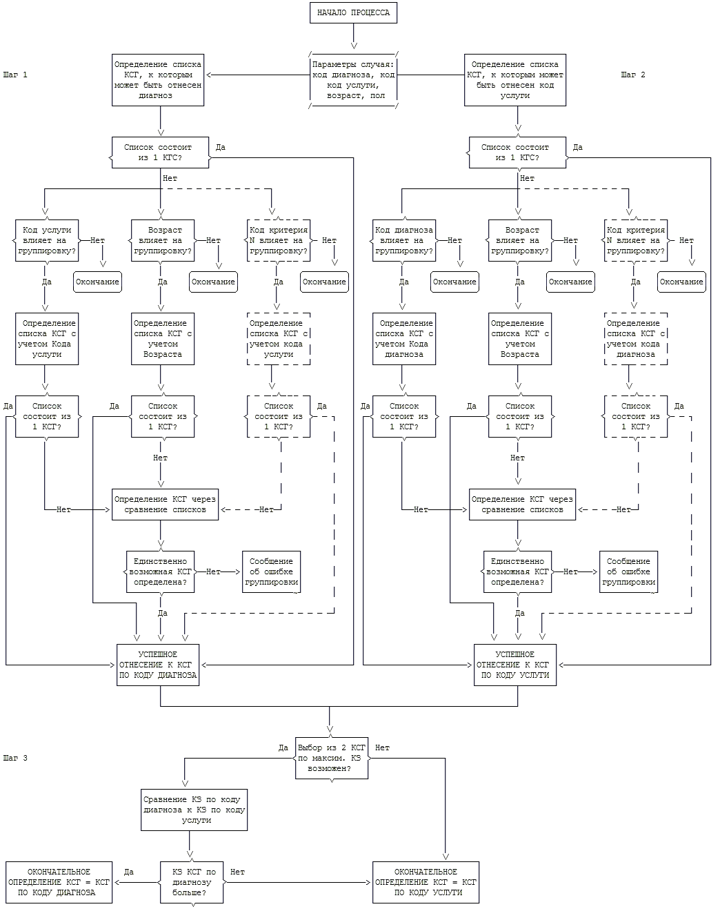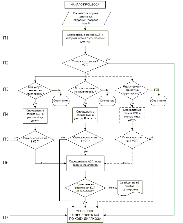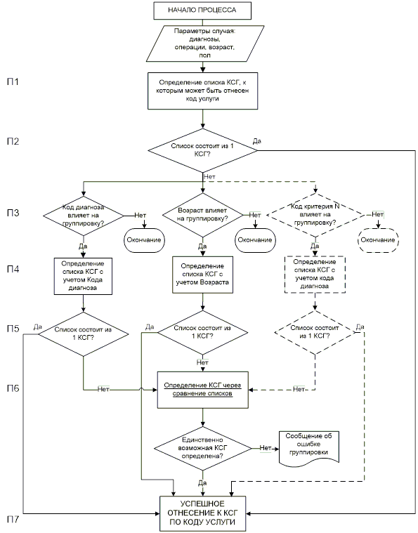 Схематически данный процесс изображен на Рисунке 1 в Приложении. Количество стандартных блоков проверки классификационных критериев по пунктам П3-П5 (выделено пунктиром) может варьироваться в соответствии с количеством классификационных критериев. В описываемой стандартной версии их 4 (пол, возраст, код услуги, длительность пребывания в стационаре). При выделении подгрупп (критерий выделения подгруппы обозначен как "Код критерия N"), количество блоков может быть увеличено с использованием аналогичной схемы.