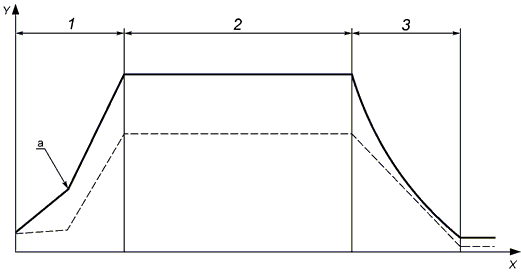 X - время; Y - температура (___); давление насыщенного пара; 1 - фаза нагрева; 2 - фаза выдержки; 3 - фаза охлаждения; a - клапан закрыт