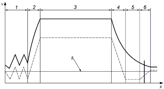 X - время; Y - температура (___); давление насыщенного пара; 1 - фаза удаления воздуха; 2 - фаза подачи пара; 3 - фаза выдержки; 4 - фаза выпуска пара; 5 - фаза сушки; 6 - фаза сброса вакуума; a - атмосферное давление