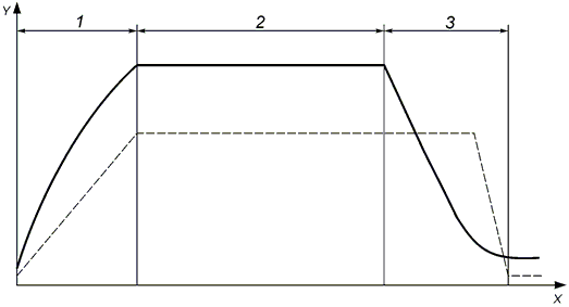 X - время; Y - температура (___); избыточное давление воздуха; 1 - фаза нагрева; 2 - фаза выдержки; 3 - фаза охлаждения