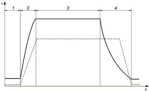 X - время; Y - температура (___); избыточное давление воздуха; 1 - фаза подачи воды; 2 - фаза нагрева; 3 - фаза выдержки; 4 - фаза охлаждения