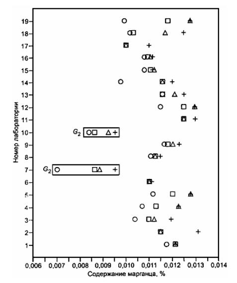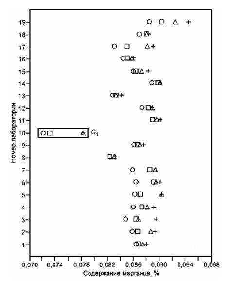 Примечание - Точки в прямоугольной рамке означают, что соответствующие результаты измерений были идентифицированы как выбросы согласно критерию Граббса дня одного выброса (G1).