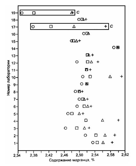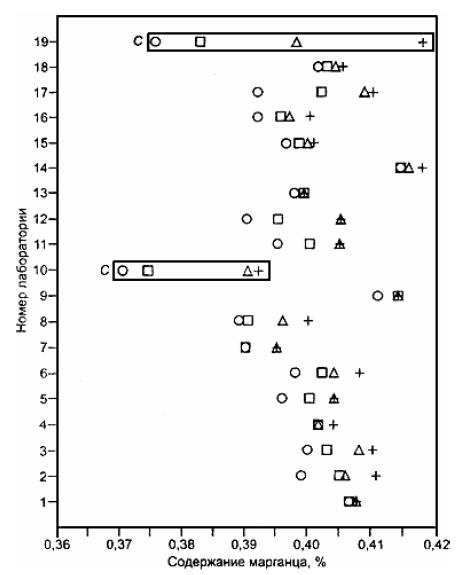 Примечание - Точки в прямоугольных рамках означают, что результаты измерений были идентифицированы как выбросы согласно критерию Кохрена (С).