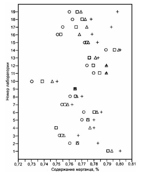 С целью оценки прецизионности химико-аналитического метода данные были подвергнуты анализу согласно процедуре, описанной в ГОСТ Р ИСО 5725-2. Результаты измерений для каждого уровня представлены на рисунках В.1 - В.5.