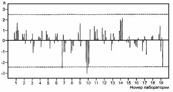 Рисунок В.6 - Содержание марганца в железных рудах. Значения h , сгруппированные по лабораториям