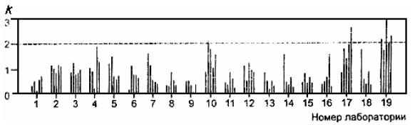 Значения статистик h и k представлены на рисунках В.6 и В.7. Значения h (рисунок В.6) отчетливо свидетельствуют, что лаборатория N 10 получает очень низкие результаты; два из них (уровни 2 и 3) были идентифицированы как выбросы. По этой причине было решено полностью исключить результаты лаборатории N 10, это должно бы стать предметом особого рассмотрения и принятия необходимых мер. Кроме того, были отбракованы данные на уровне 1 в лаборатории N 7, идентифицированные как выброс согласно критерию Граббса. Значения k (рисунок В.7) свидетельствуют о том, что лаборатории N 10, N 17 и N 19 имеют тенденцию к получению несколько более высокой внутрилабораторной вариации по сравнению с остальными. Здесь опять же необходимо принять соответствующие меры в форме обследования этих лабораторий или, в случае необходимости, в форме ужесточения процедуры выполнения измерений. Было также решено отбраковать выбросы, идентифицированные согласно критерию Кохрена; т.е. данные на уровнях 3 и 5 в лаборатории N 19 и на уровне 5 в лаборатории N 17.