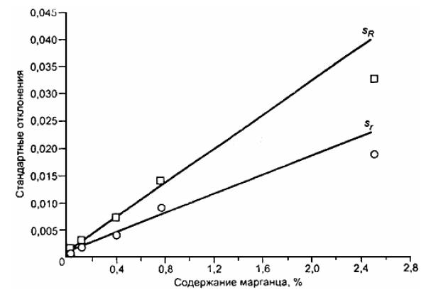Рисунок В.8 - Содержание марганца в железных рудах. Стандартные отклонения повторяемости и воспроизводимости как линейные функции уровня концентрации \т