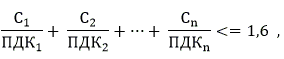 При совместном присутствии в атмосферном воздухе нескольких веществ, обладающих суммацией действия, сумма их концентраций не должна превышать 1 (единицы) при расчете по формуле: