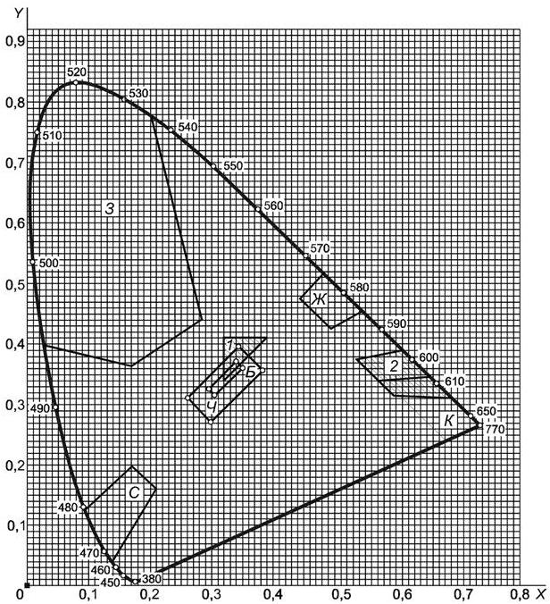 К - область красного цвета; Ж - область желтого цвета; З - область зеленого цвета; С - область синего цвета; Б - область белого цвета; Ч - область черного цвета; 1 - предпочтительная малая область для желтовато-белого фотолюминесцентного цвета; 2 - предпочтительная малая область для красного (красно-оранжевого) фотолюминесцентного цвета