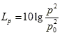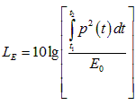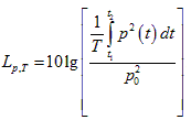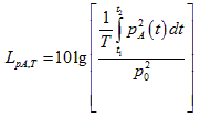 3.1.3. Эквивалентный уровень звукового давления , дБ: десятикратный десятичный логарифм отношения усредненного на заданном временном интервале T (с началом t1 и окончанием t2) квадрата звукового давления p к квадрату опорного звукового давления