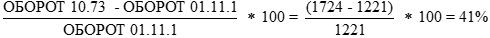 Далее определяем необходимость изменения основного вида экономической деятельности. Рассчитываем превышение показателя (оборот) деятельности группы 10.73 "Производство макаронных изделий, кускуса и аналогичных мучных изделий" над показателем деятельности, в соответствии с которой организация классифицируется в настоящее время (вид 01.11.1 "Выращивание зерновых культур").