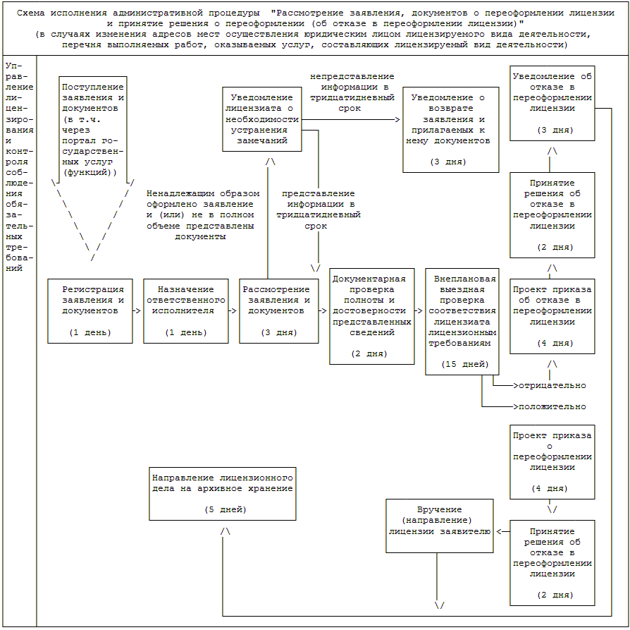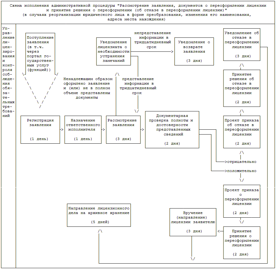 2) принятие решения о переоформлении (об отказе в переоформлении) лицензии (в случаях реорганизации юридического лица в форме преобразования, изменения его наименования, адреса места нахождения, прекращения деятельности по одному адресу или нескольким адресам мест ее осуществления, указанным в лицензии) - 10 рабочих дней со дня поступления в Росздравнадзор (территориальные органы Росздравнадзора) надлежащим образом оформленного заявления о переоформлении лицензии и других документов (сведений), предусмотренных пунктами 21, 22 и 25 Административного регламента; (в ред. Приказа Минздрава РФ от 18.07.2016 N 521н)