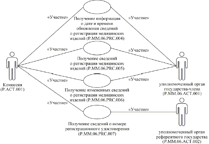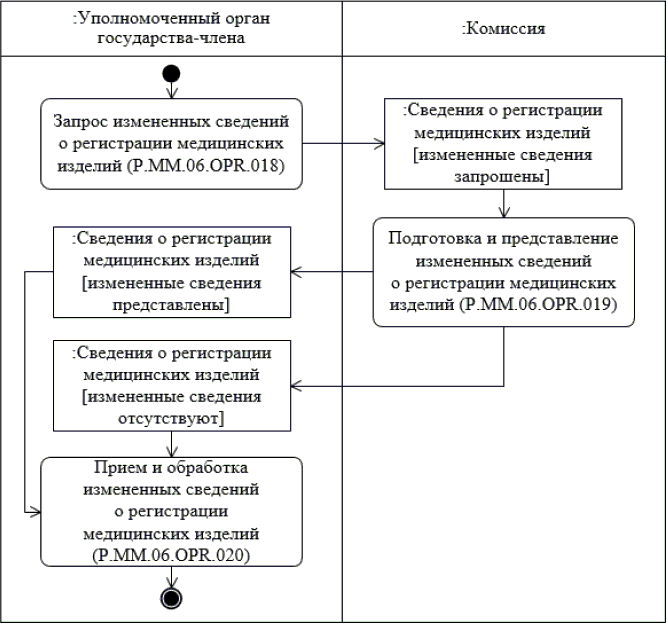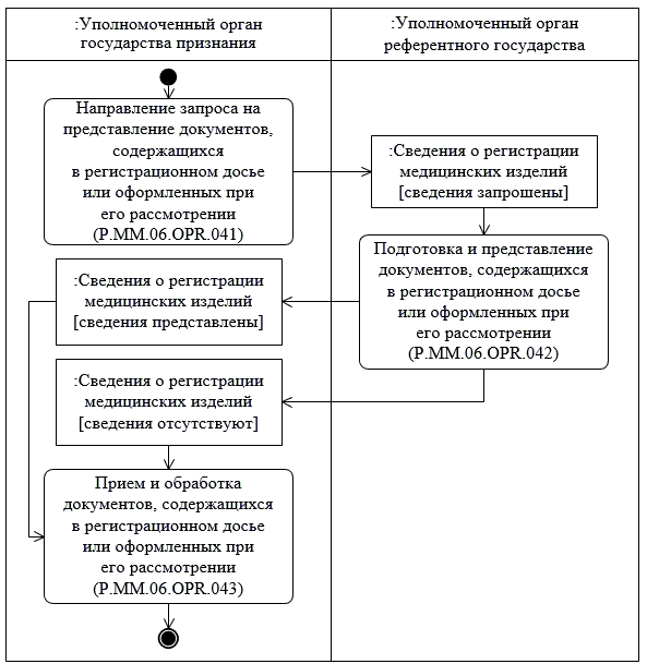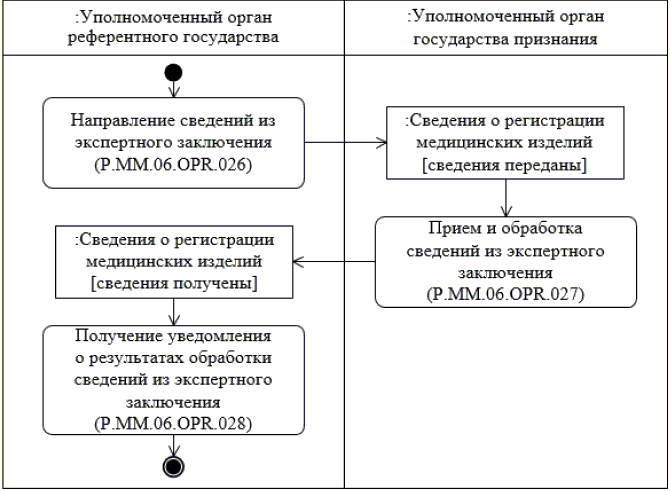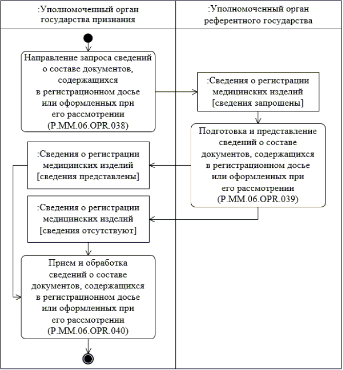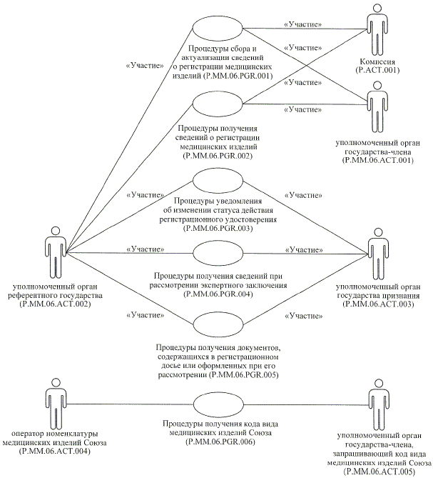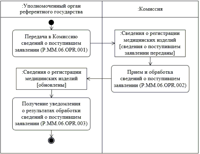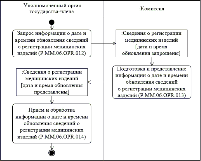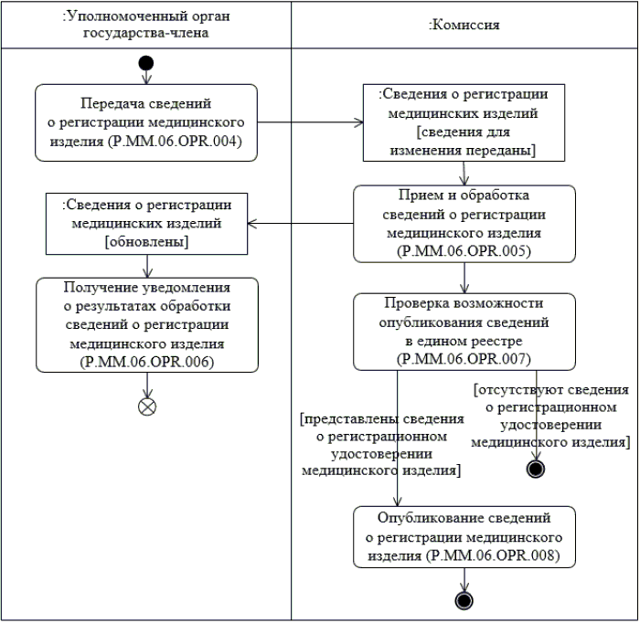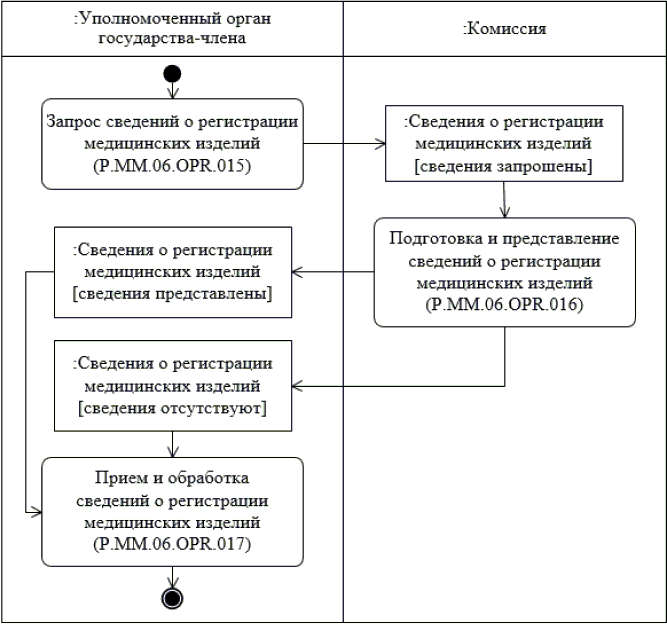| P.MM.06.ACT.001 | уполномоченный орган государства-члена | уполномоченный орган (экспертная организация) референтного государства или государства признания, который осуществляет процедуры, связанные с регистрацией медицинских изделий, в объеме, предусмотренном его ролью в процедуре регистрации, представляет в Комиссию сведения о зарегистрированных медицинских изделиях и заявлениях на регистрацию медицинских изделий, а также получает сведения о регистрации медицинских изделий по запросу с использованием интегрированной системы |