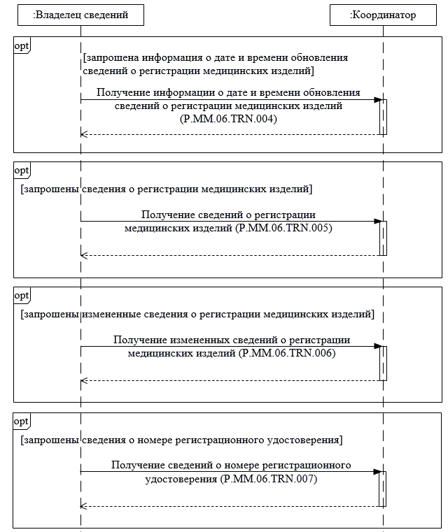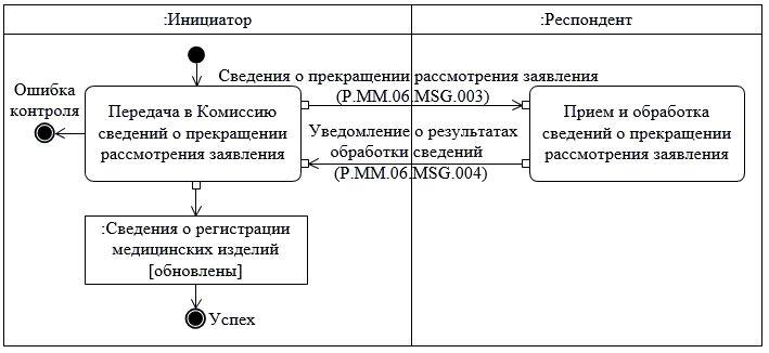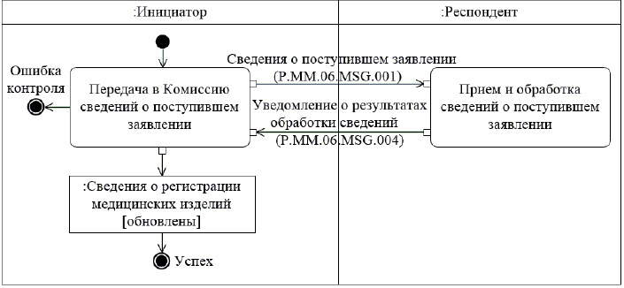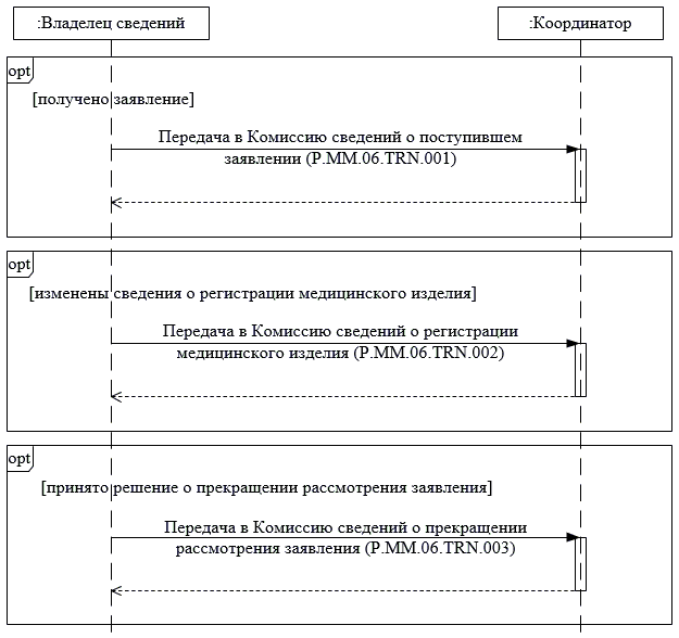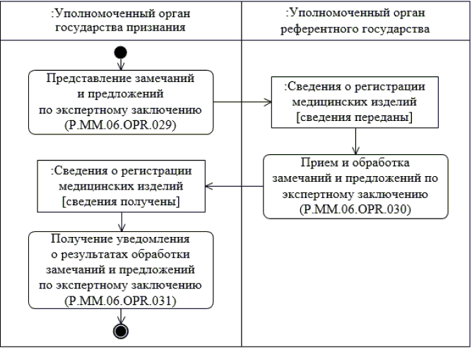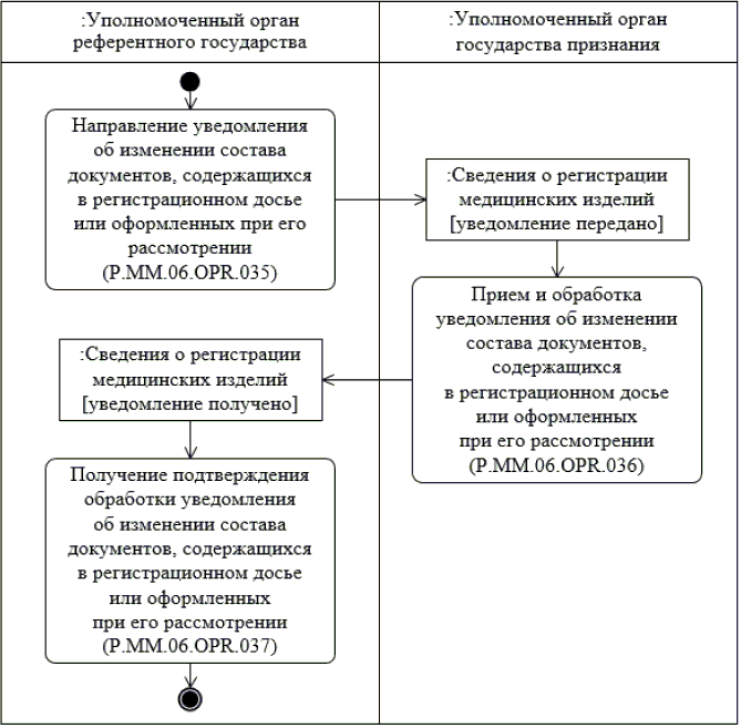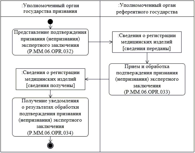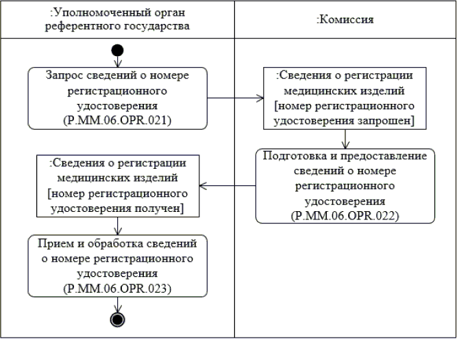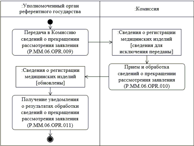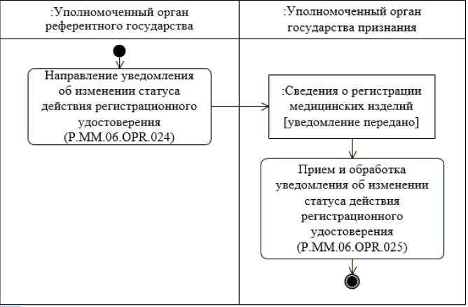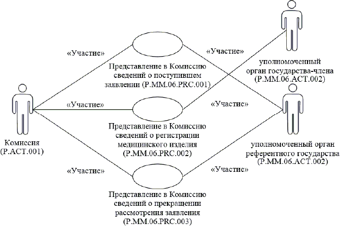 | P.MM.06.ACT.001 | уполномоченный орган государства-члена | уполномоченный орган (экспертная организация) референтного государства или государства признания, который осуществляет процедуры, связанные с регистрацией медицинских изделий, в объеме, предусмотренном его ролью в процедуре регистрации, представляет в Комиссию сведения о зарегистрированных медицинских изделиях и заявлениях на регистрацию медицинских изделий, а также получает сведения о регистрации медицинских изделий по запросу с использованием интегрированной системы |