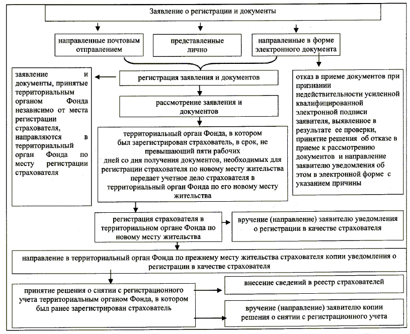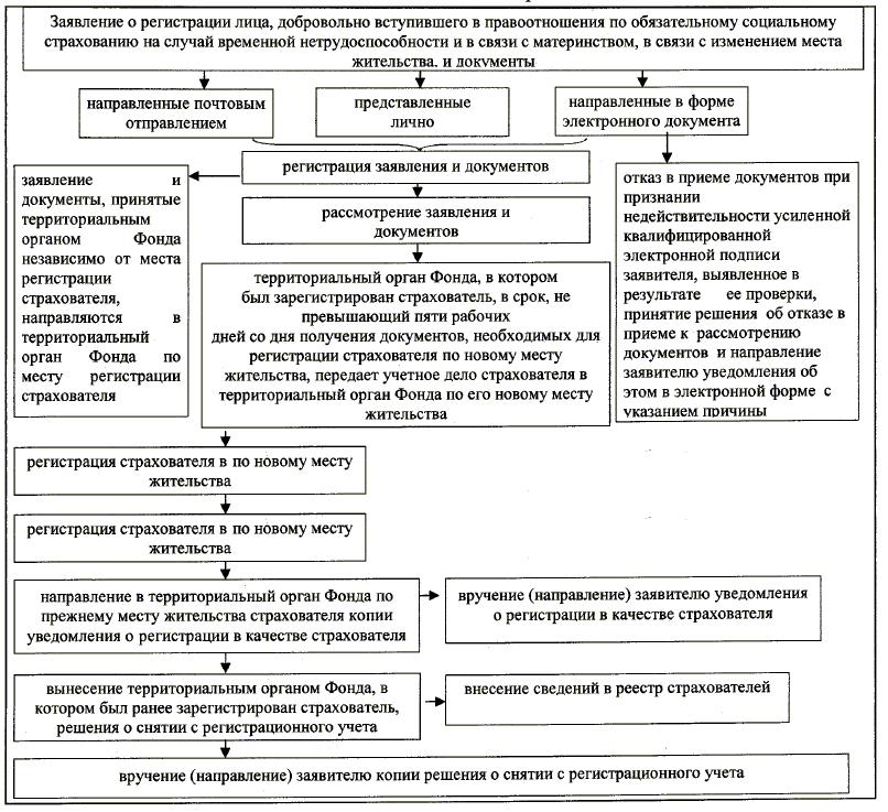 БЛОК-СХЕМА ПОСЛЕДОВАТЕЛЬНОСТИ АДМИНИСТРАТИВНЫХ ПРОЦЕДУР (ДЕЙСТВИЙ) ТЕРРИТОРИАЛЬНОГО ОРГАНА ФОНДА СОЦИАЛЬНОГО СТРАХОВАНИЯ РОССИЙСКОЙ ФЕДЕРАЦИИ ПО СНЯТИЮ С РЕГИСТРАЦИОННОГО УЧЕТА И РЕГИСТРАЦИИ В КАЧЕСТВЕ СТРАХОВАТЕЛЯ В СВЯЗИ С ИЗМЕНЕНИЕМ МЕСТА ЖИТЕЛЬСТВА СТРАХОВАТЕЛЯ