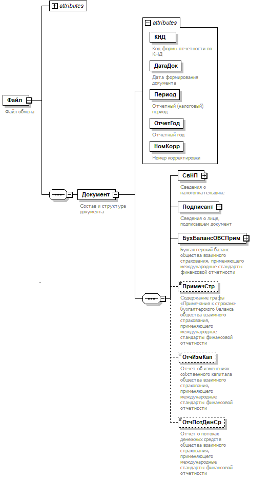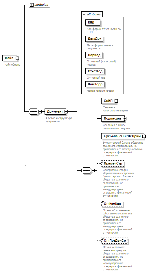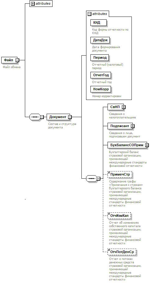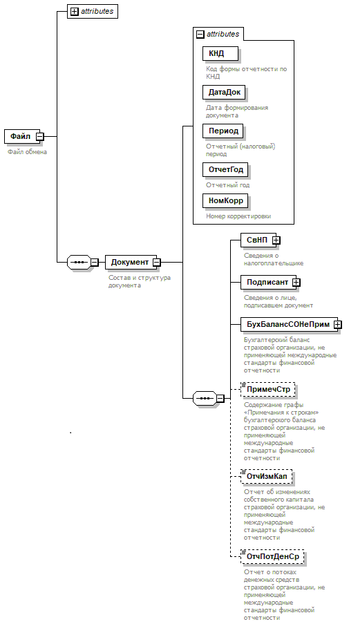 | Отчет о потоках денежных средств страховой организации, не применяющей международные стандарты финансовой отчетности | ОтчПотДенСр | П | T(1-255) | Н | Имя файла имеет вид R_Т_A_K_О_N1_GGGGMMDD_N2, где: R_Т - префикс, принимающий значение NO_OPDSSO1; A_K - идентификатор получателя информации, где: A - идентификатор получателя, которому направляется файл обмена, K - идентификатор конечного получателя, для которого предназначена информация из данного файла обмена; идентификаторы A и К имеют вид для налоговых органов - четырехразрядный код (код по СОНО); О - идентификатор отправителя информации, имеет вид: для организаций - девятнадцатиразрядный код (ИНН и КПП налогоплательщика организации (обособленного подразделения); для физических лиц - двенадцатиразрядный код (ИНН физического лица, при наличии. При отсутствии ИНН - последовательность из двенадцати нулей); GGGG - год, MM - месяц, DD - день формирования файла; N1, N2 - идентификационные номера файла: N1 - должен совпадать с идентификационным номером файла бухгалтерской отчетности N2 - уникален для каждого файла независимо от принадлежности к документу (длина - от 1 до 36 знаков). Расширение имени файла - xls | doc | rtf | tif | pdf | jpg. |