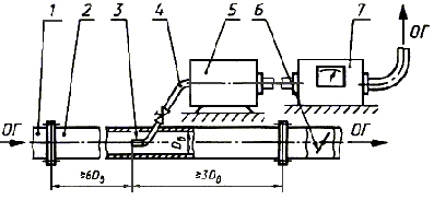 1 - выпускной коллектор (труба) дизеля; 2 - выпускной трубопровод стенда; 3 - пробоотборный зонд; 4 - газоподводящая труба с краном; 5 - теплообменник с ресивером; 6 - регулирующая заслонка; 7 - дымомер; ОГ - отработавшие газы