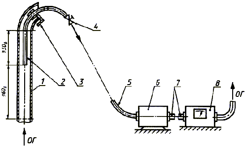 1 - выпускная труба машины (дизеля); 2 - пробоотборный зонд; 3 - зажим; 4 - газоподводящая труба с краном; 5, 7 - газоподводящие трубы; 6 - теплообменник с ресивером; 8 - дымомер; ОГ - отработавшие газы