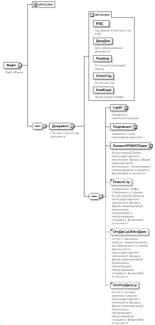 | Отчет о движении средств, предназначенных для обеспечения уставной деятельности негосударственного пенсионного фонда в форме некоммерческой организации, применяющего международные стандарты финансовой отчетности | ОтчДвСрОбУстДеят | П | T(1-255) | Н | Имя файла имеет вид R_Т_A_K_О_N1_GGGGMMDD_N2, где: R_Т - префикс, принимающий значение NO_ODSNPFNO2; A_K - идентификатор получателя информации, где: A - идентификатор получателя, которому направляется файл обмена, K - идентификатор конечного получателя, для которого предназначена информация из данного файла обмена; идентификаторы A и К имеют вид для налоговых органов - четырехразрядный код (код по СОНО); О - идентификатор отправителя информации, имеет вид: для организаций - девятнадцатиразрядный код (ИНН и КПП налогоплательщика организации (обособленного подразделения); для физических лиц - двенадцатиразрядный код (ИНН физического лица, при наличии. При отсутствии ИНН - последовательность из двенадцати нулей); GGGG - год, MM - месяц, DD - день формирования файла; N1, N2 - идентификационные номера файла: N1 - должен совпадать с идентификационным номером файла бухгалтерской отчетности N2 - уникален для каждого файла независимо от принадлежности к документу (длина - от 1 до 36 знаков). Расширение имени файла - xls | doc | rtf | tif | pdf | jpg. |