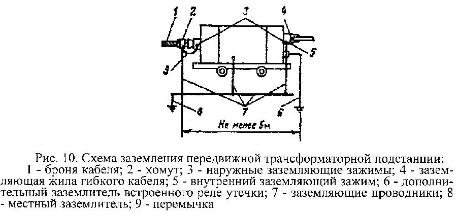 26. При обнаружении соединения какой-либо токоведущей части электроустановки с землей запрещается до отключения ее приближаться к месту такого повреждения на расстояние менее 4 - 5 м в закрытых распределительных устройствах и 8 - 10 м на открытых подстанциях.