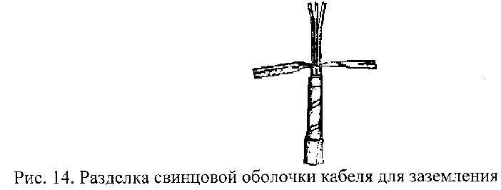 13. При ремонте металлического экрана жил необходимо отделить неисправную жилу. На металлический экран наложить бандаж прядью из 8 - 10 медных луженых проволок на расстоянии не более 260 мм друг от друга.