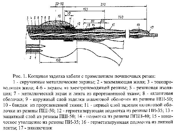 пространство между жилами заполнить резиной ПШ-50 на участке 30 - 35 мм от среза жгута, масса резины должна быть достаточной для заполнения междужильного пространства;