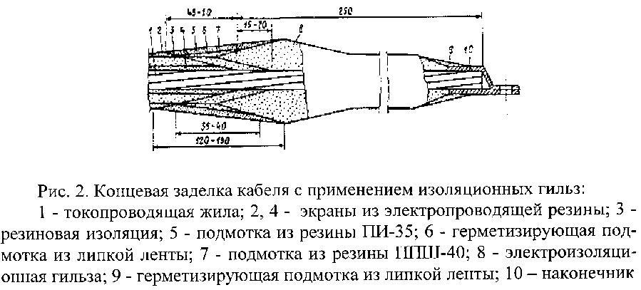 Место ввода жилы кабеля в наконечник загерметизировать путем намотки на жилу и хвостовик наконечника липкой изоляционной ленты или миткалевой ленты с лаком З-1001.