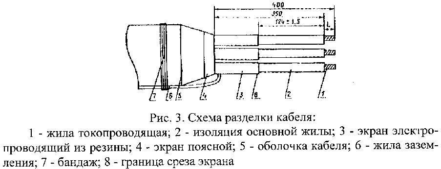 Изоляцию с электропроводящими экранами снимают на расстоянии 150 мм от торца кабеля и на расстоянии 200 мм накладывают бандаж на металлический экран. На каждую токопроводящую жилу около границы среза изоляции накладывают временный бандаж из проволоки диаметром 1,5 мм.