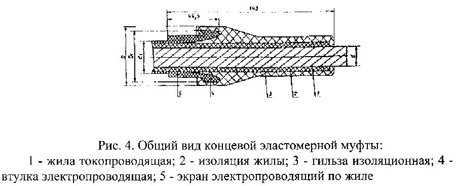 На поверхность изоляции жилы надевают изоляционную гильзу до границы среза экрана. Изоляционная гильза не должна заходить на экран (за границу среза экрана) из электропроводящей резины. Электропроводящую втулку придвигают к изоляционной гильзе и смыкают их.