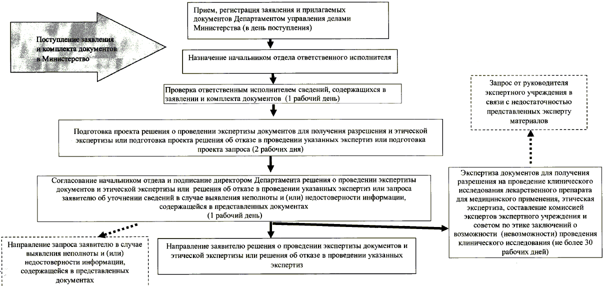 БЛОК-СХЕМА ИСПОЛНЕНИЯ АДМИНИСТРАТИВНЫХ ПРОЦЕДУР "ПРИЕМ, РЕГИСТРАЦИЯ, РАССМОТРЕНИЕ ПОСТУПИВШИХ ОТ ЗАЯВИТЕЛЯ ДОКУМЕНТОВ НА ПРЕДОСТАВЛЕНИЕ ГОСУДАРСТВЕННОЙ УСЛУГИ И ПРИНЯТИЕ РЕШЕНИЕ О ПРОВЕДЕНИИ ЭКСПЕРТИЗЫ ДОКУМЕНТОВ ДЛЯ ПОЛУЧЕНИЯ РАЗРЕШЕНИЯ НА ПРОВЕДЕНИЕ КЛИНИЧЕСКОГО ИССЛЕДОВАНИЯ И ЭТИЧЕСКОЙ ЭКСПЕРТИЗЫ ИЛИ ОБ ОТКАЗЕ В ПРОВЕДЕНИИ УКАЗАННЫХ ЭКСПЕРТИЗ"
