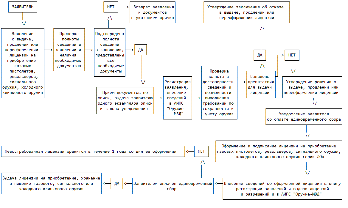 Уведомляем, что Ваше заявление о выдаче (продлении или переоформлении) лицензии на приобретение газовых пистолетов, револьверов, сигнального оружия, холодного клинкового оружия, предназначенного для ношения с национальными костюмами народов Российской Федерации или казачьей формой, рассмотрено.