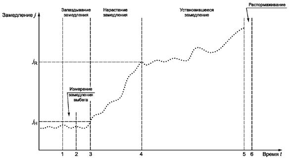 1 - начало торможения; 2 - окончание измерения замедления выбега КТС; 3 - начало нарастания замедления; 4 - начало фазы торможения с установившемся замедлением; 5 - начало растормаживания; 6 - остановка КТС