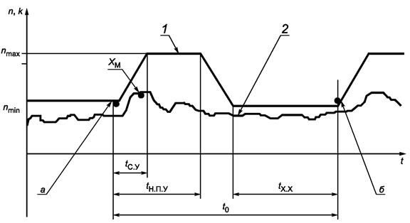 а - начало 1-го цикла свободного ускорения; б - окончание 1-го и начало 2-го цикла свободного ускорения; 1 - частота вращения коленчатого вала двигателя (n); 2 - дымность отработавших газов двигателя (k); - минимальная частота вращения;