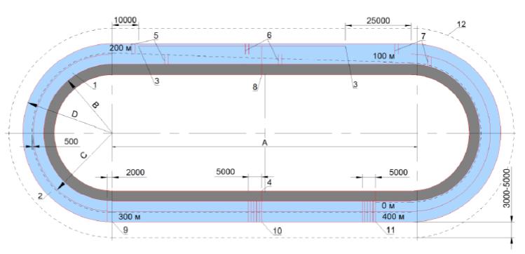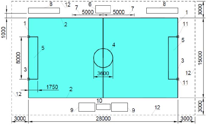 1 - ограничительная линия; 2 - боковая линия; 3 - линия гола; 4 - центральный круг; 5 - зачетное поле; 6 - судейский стол; 7 - зона ожидания замены; 8 - скамейка запасных; 9 - зона штрафников; 10 - стол штрафного судьи; 11 - конус ворот; 12 - граница спортивной зоны