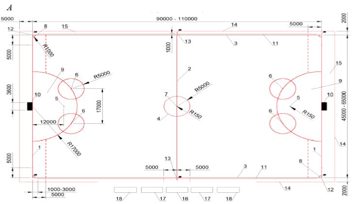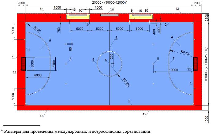 1 - линия ворот; 2 - боковая линия; 3 - средняя линия; 4 - штрафная площадь; 5 - центральный круг; 6 - центральный круг; 7 - отметка пенальти; 8 - дополнительная отметка пенальти; 9 - площадь ворот; 10 - ограждение; 11 - ворота; 12 - граница спортивной зоны; 13 - зона безопасности; 14 - стол хронометриста; 15 - скамейка запасных; 16 - калитка