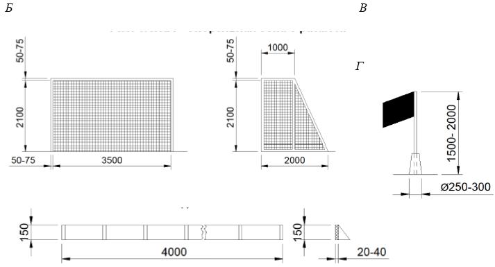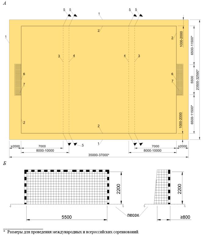 А - спортивная зона для пляжного футбола; Б - ворота для пляжного футбола 1 - границы песчаной площадки; 2 - маркировочная лента; 3 - линия удаления (воображаемая); 4 - линия штрафного пространства (воображаемая); 5 - маркировочные флажки; 6 - линия ворот; 7 - ворота