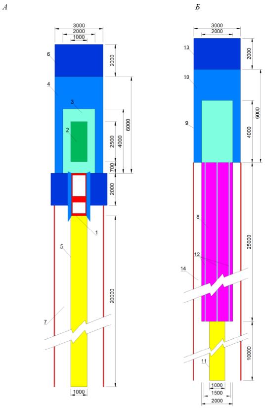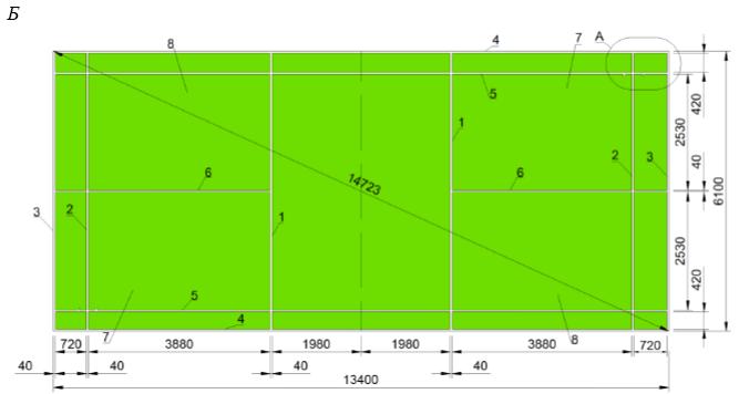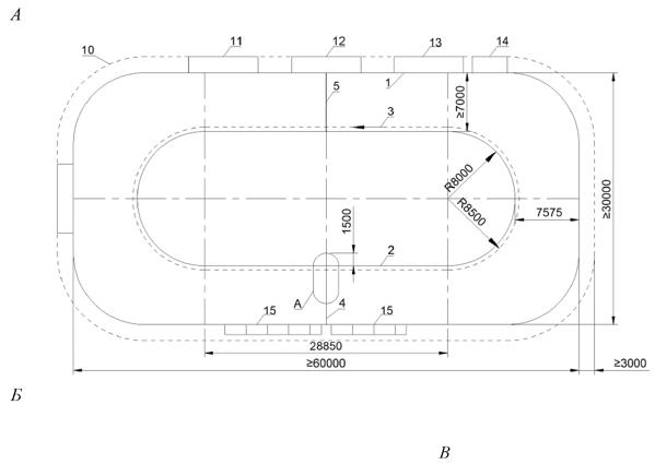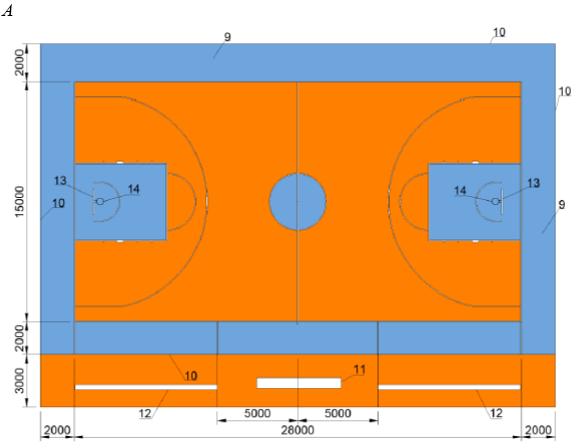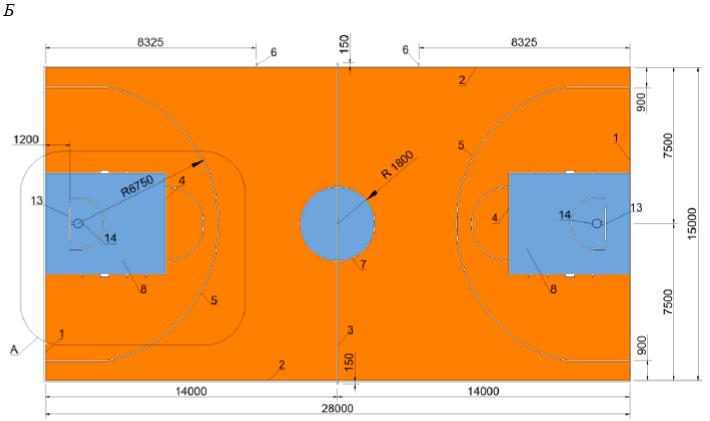 А - дорожка разбега двойного минитрамплина; Б - акробатическая дорожка 1 - двойной мини-трамп; 2 - зона А; 3 - зона В; 4 - зона С; 5 - дорожка для разбега; 6 - дополнительный мат безопасности; 7 - зона безопасности; 8 - акробатическая дорожка; 9 - зона приземления; 10 - площадь приземления; 11 - дорожка для разбега; 12 - линии; 13 - дополнительный мат безопасности; 14 - зона безопасности
