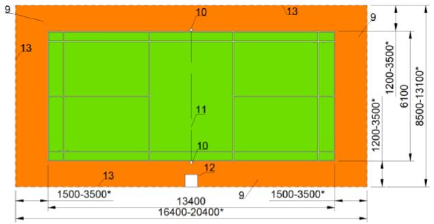 4 - средняя линия подачи; 5 - линия подачи; 6 - боковая линия для одиночной игры; 7 - боковая линия для парной игры; 8 - задняя линия; 9 - средняя метка; 10 - первое поле подачи; 11 - второе поле подачи; 12 - столб для парной игры; 13 - подпорка для парной игры; 14 - сетка