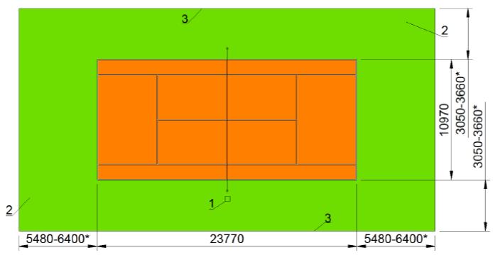 1 - ковер; 2 - зона безопасности; 3 - граница спортивной зоны