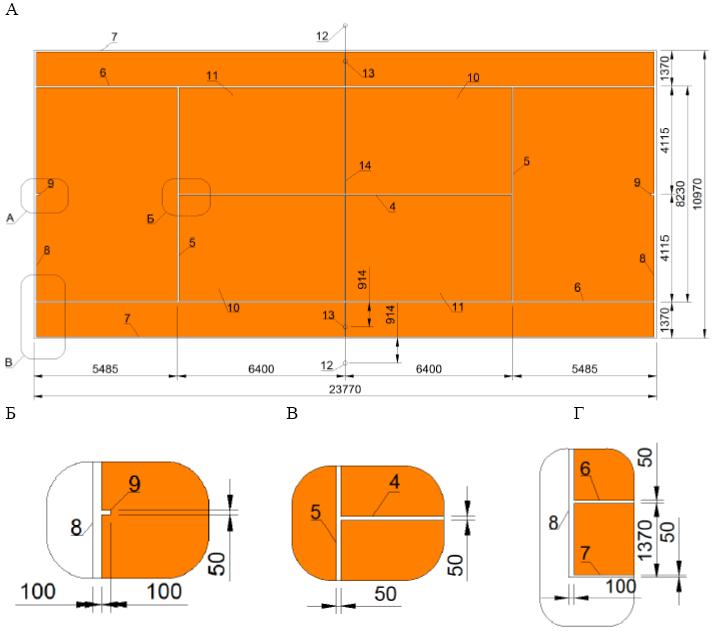 А - разметка теннисного корта; Б - разметка теннисного корта (узел "А"); В - разметка теннисного корта (узел "Б"); Г - разметка теннисного корта (узел "В")
