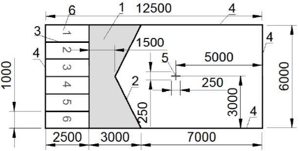 1 - не засчитываемая для "джек-бола" зона; 2 - "V"-линия; 3 - линия зоны игры/боксов; 4 - линия границы; 5 - крест (точка установки "джек-бола"); 6 - бокс (место игрока)