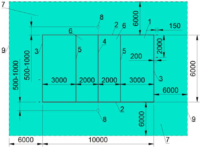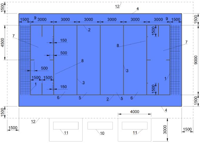 1 - игровая площадка; 2 - боковая линии; 3 - лицевая линии; 4 - центральная линия; 5 - двухметровая линия; 6 - передняя зона; 7 - зона обслуживания; 8 - стойка; 9 - граница спортивной зоны