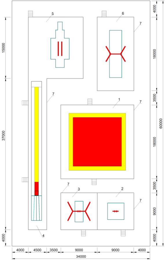 1 - площадка для вольных упражнений; 2 - зона снаряда "конь для махов"; 3 - зона снаряда "кольца"; 4 - зона опорного прыжка; 5 - зона параллельных брусьев; 6 - зона для упражнений на перекладине; 7 - помост / граница зоны безопасности