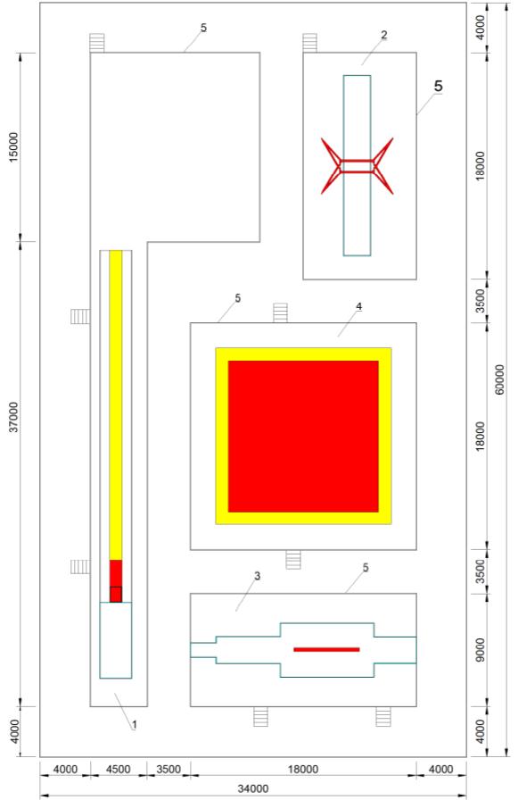 1 - зона опорного прыжка; 2 - зона упражнений на разновысоких брусьях; 3 - зона снаряда "бревно"; 4 - площадка для вольных упражнений; 5 - помост / граница зоны безопасности