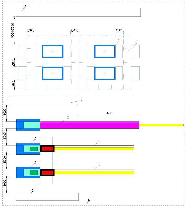 1 - трамплин; 2 - зона безопасности с матами; 3 - зона жюри; 4 - акробатическая дорожка; 5 - зона жюри; 6 - дорожка разбега для двойного мини-трампа; 7 - двойной мини-трамп; 8 - зона жюри; 9 - граница спортивной зоны