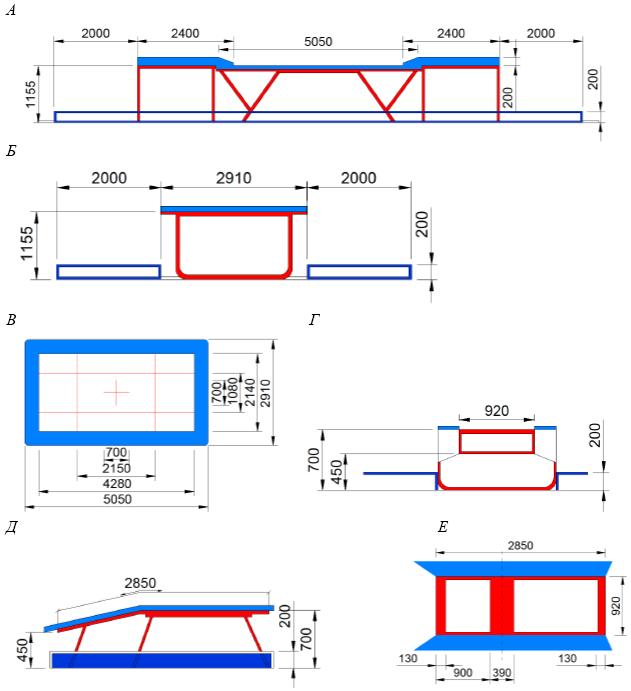 А - трамплин. Вид сбоку; Б - трамплин. Вид спереди; В - трамплин. Вид сверху; Г - двойной минитрамплин. Вид спереди; Д - двойной минитрамплин. Вид сбоку; Е - двойной минитрамплин. Вид сверху, перпендикулярно в обе области