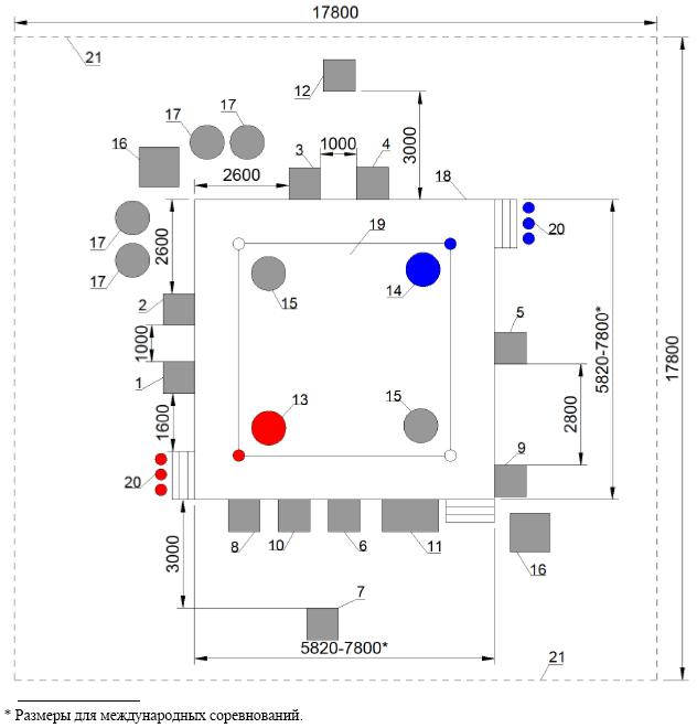 1 - судья 1; 2 - судья 2; 3 - судья 3; 4 - судья 4; 5 - судья 5; 6 - технический делегат (супервайзер); 7 - специалист, оценивающий работу рефери; 8 - официальный информатор; 9 - хронометрист/ оператор гонга; 10 - оператор судейской электронной аппаратуры; 11 - стол врача; 12 - специалист, оценивающий работу боковых судей; 13 - красный угол; 14 - синий угол; 15 - нейтральный угол; 16 - стойки камер; 17 - фотографы; 18 - помост; 19 - ринг; 20 - места секундантов; 21 - границы спортивной зоны