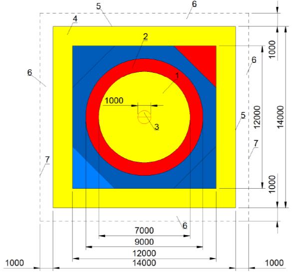 1 - рабочая зона ковра; 2 - зона пассивности; 3 - центр ковра; 4 - зона безопасности; 5 - граница площадки (помоста); 6 - зона размещения судей и обслуживающего персонала; 7 - граница спортивной зоны